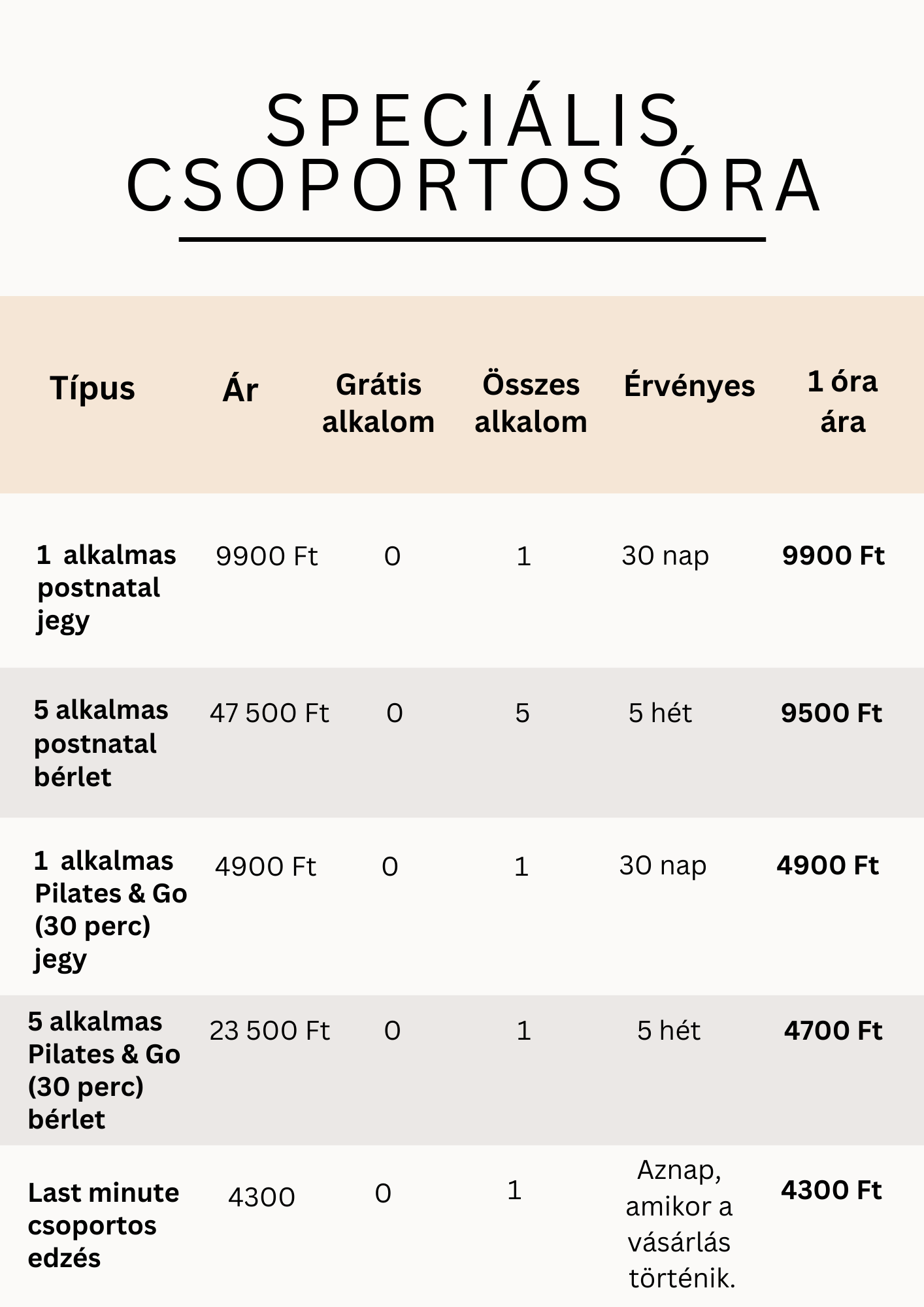 ** Last Minute edzés: Olyan csoportos óra, amelyre az edzés kezdete előtti 60 perces időszakban, előzetes foglalás nélkül, érkezési sorrendben, kizárólag a helyszínen lehet jegyet vásárolni 50% kedvezménnyel, amennyiben van még szabad hely, és az adott óra már biztosan megtartásra kerül (legalább két fő bejelentkezett), 16:00 után indul, van recepciós a szalonban.